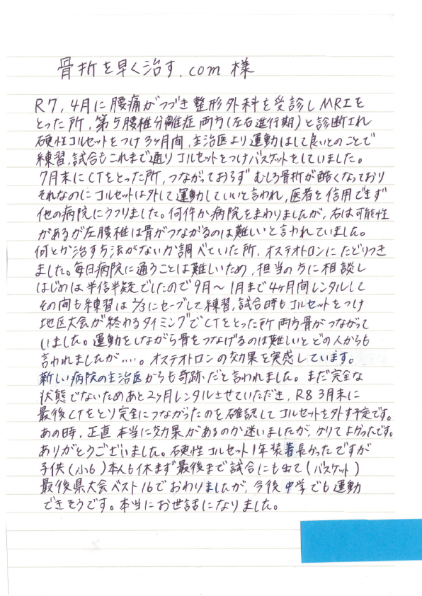 右が腰椎分離症、発見時、左が、オステオトロンを3ヵ月使用とコルセット固定での画像になります。画像、右の右側の骨は完全に離れていて、整形外科からは、これは付かないと言われたそうです。最初、お電話を頂いた時は、半信半疑、でも、もしかしたらの期待で、オステオトロンをレンタルされた感じの記憶が有ります。3ヵ月後、画像を送って頂き、整形外科からは、奇跡だと、言われたそうで、お電話で少しお話しをしましたが、信じて良かったと喜んで頂きました。この瞬間が、信じて頂いてありがとうと、私達も嬉しい思いです。
